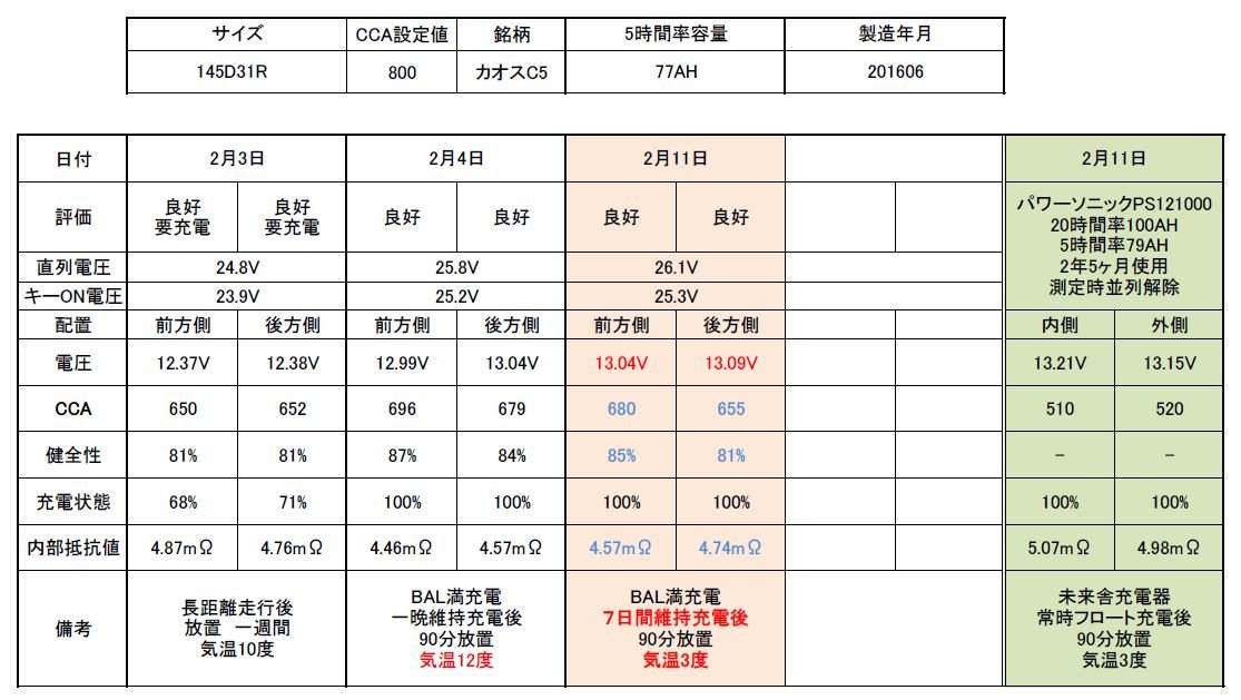 だから520CCAそのものにどうこういうつもりはない。しかし今後のため感覚的なものでなく劣化度を分析する重要な数値にはなるだろう。パワーソニックのCCA値の公表は誰もされてないのも当然だが新品の値や他オーナーの現状の値をすごく知りたいのは本音だ。読者がもし計測する機会があればぜひ教えて頂きたい。